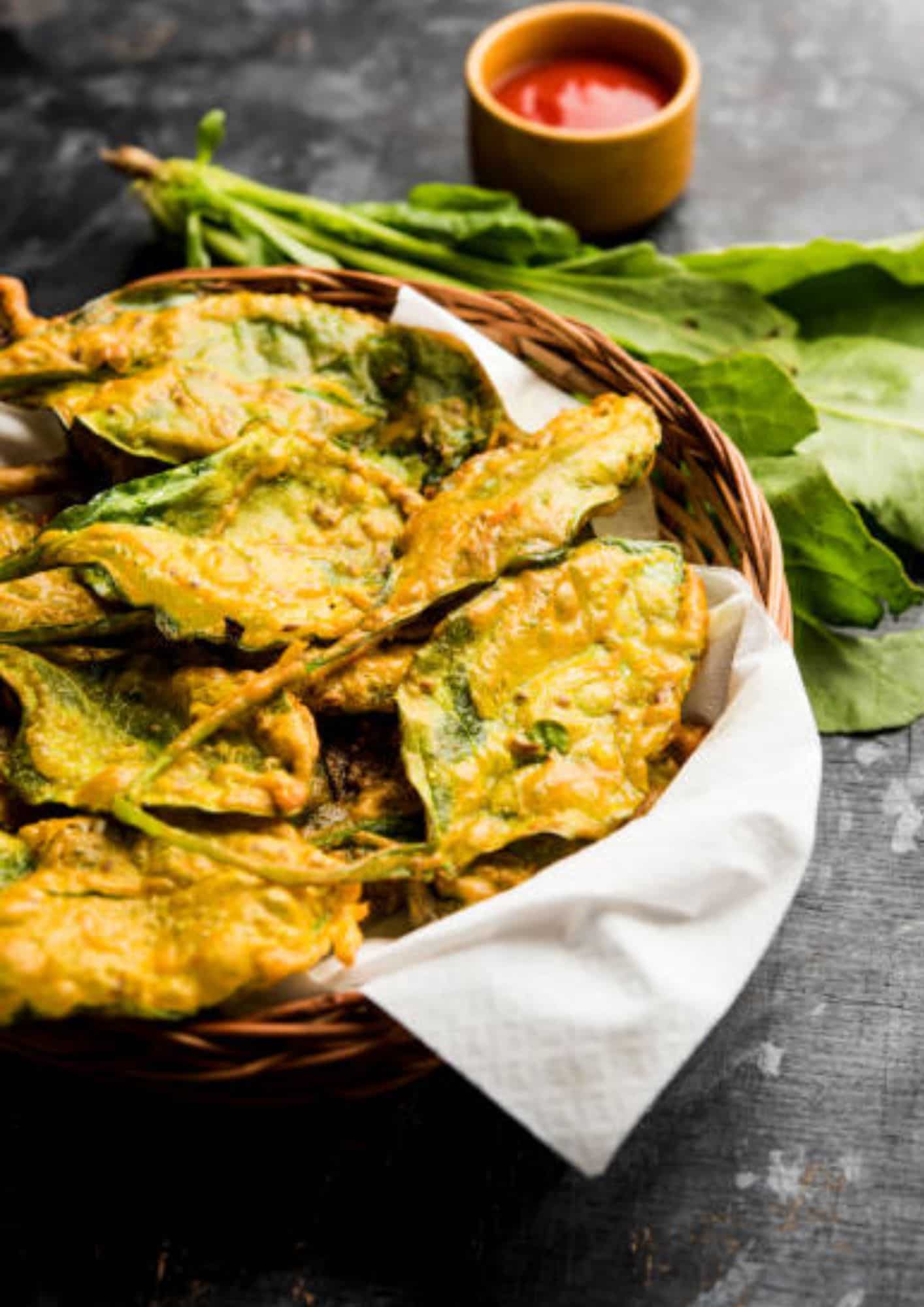 2 cups of fresh palak leaves ¼ cup of besan 2 tbsp of rice flour ½ tsp of red chilli powder ½ tsp chaat masala Salt – to taste Water ½ tsp oil