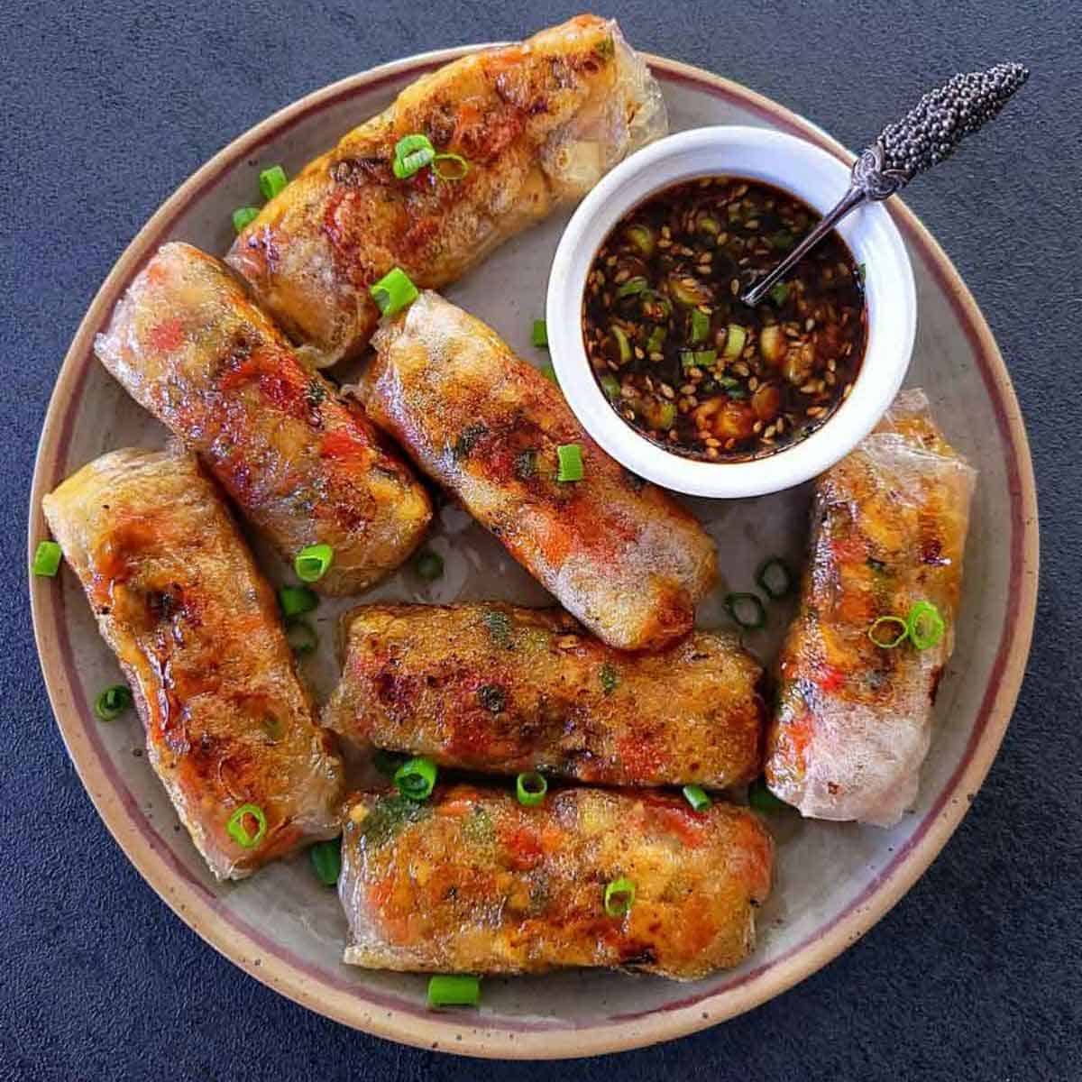 6 rice paper sheets 1 cup finely chopped cabbage ½ cup grated carrot ½ cup chopped mushrooms or tofu 1 tbsp soy sauce 1 tsp sesame oil 1 garlic clove minced Oil for frying