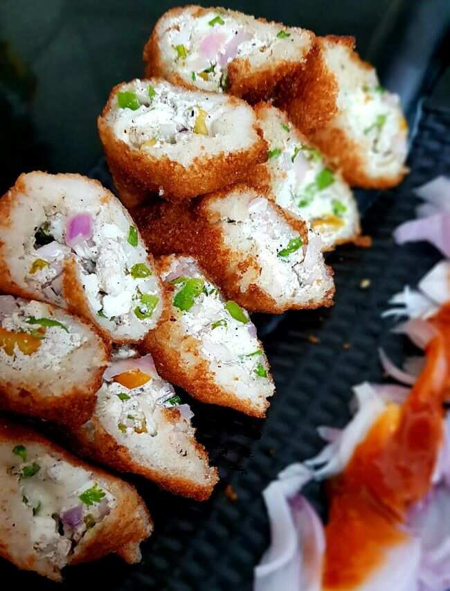 1 cup curd ¼ cup onions ¼ cup capsicum 1 tsp ginger 1 tsp green chilies 2 tbsp coriander ½ tsp black salt ½ tsp regular salt 1 tsp roasted cumin powder ½ tsp black pepper powder ¼ cup grated cheese 8-10 bread slices Oil
