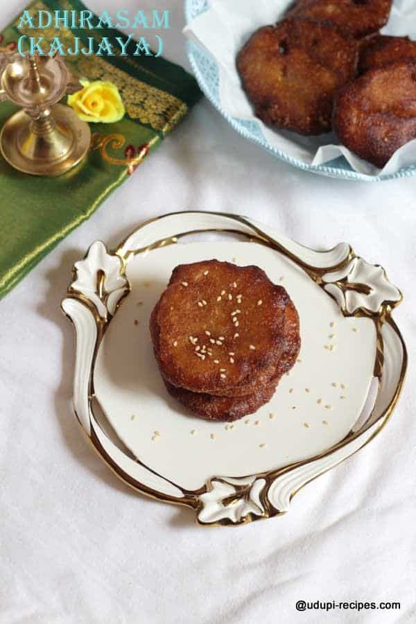 Adhirasam is a classic South Indian Diwali sweet prepared with jaggery and rice flour. It has a deep golden colour, a chewy texture inside, and a crisp outer layer. The recipe is traditional to Tamil Nadu and is prepared for festivals and special occasions.