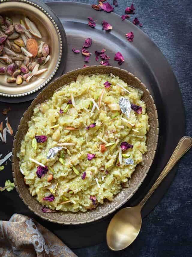 Moong dal halwa is a Rajasthani speciality, made with lentils simmered in milk with dry fruits.