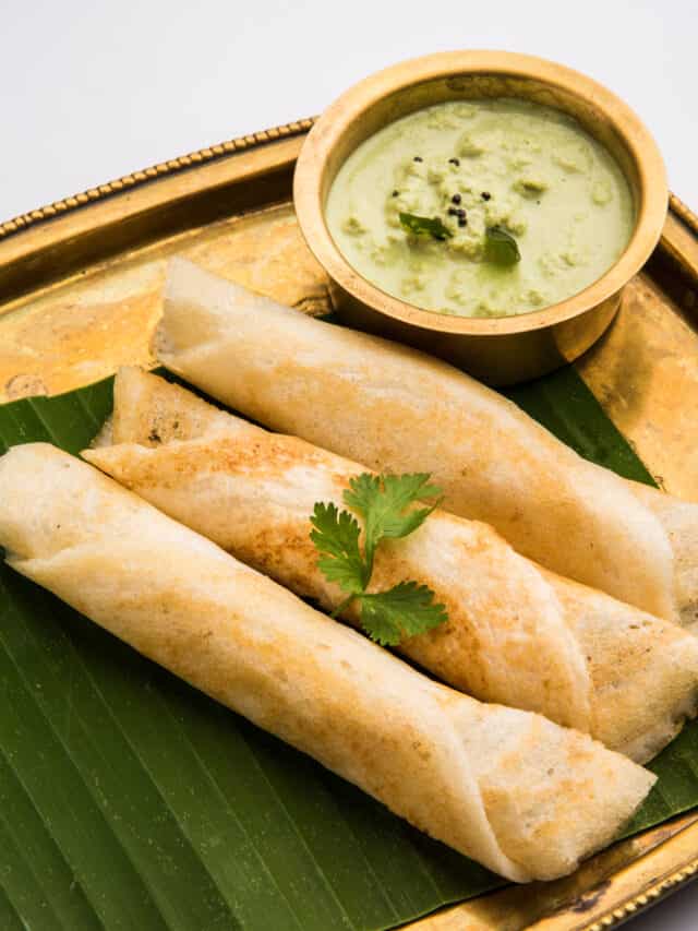 Dosa spring roll is a creative snack made by rolling spiced vegetables inside thin dosa sheets. It combines the crispiness of a roll with the flavour of South Indian dosa, making it a unique option for tea-time or light meals.
