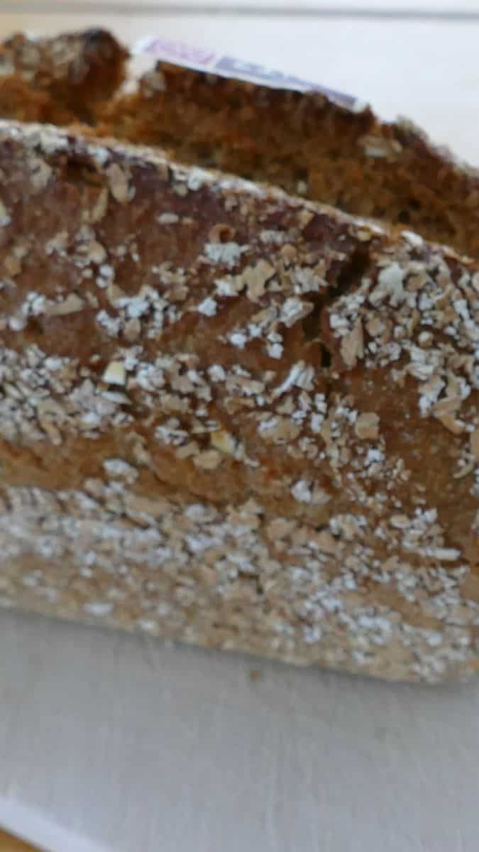 Tap the tin a little. Sprinkle oats on top. Place the loaf tin carefully in the hot pot. Cover and bake for 40 mins.