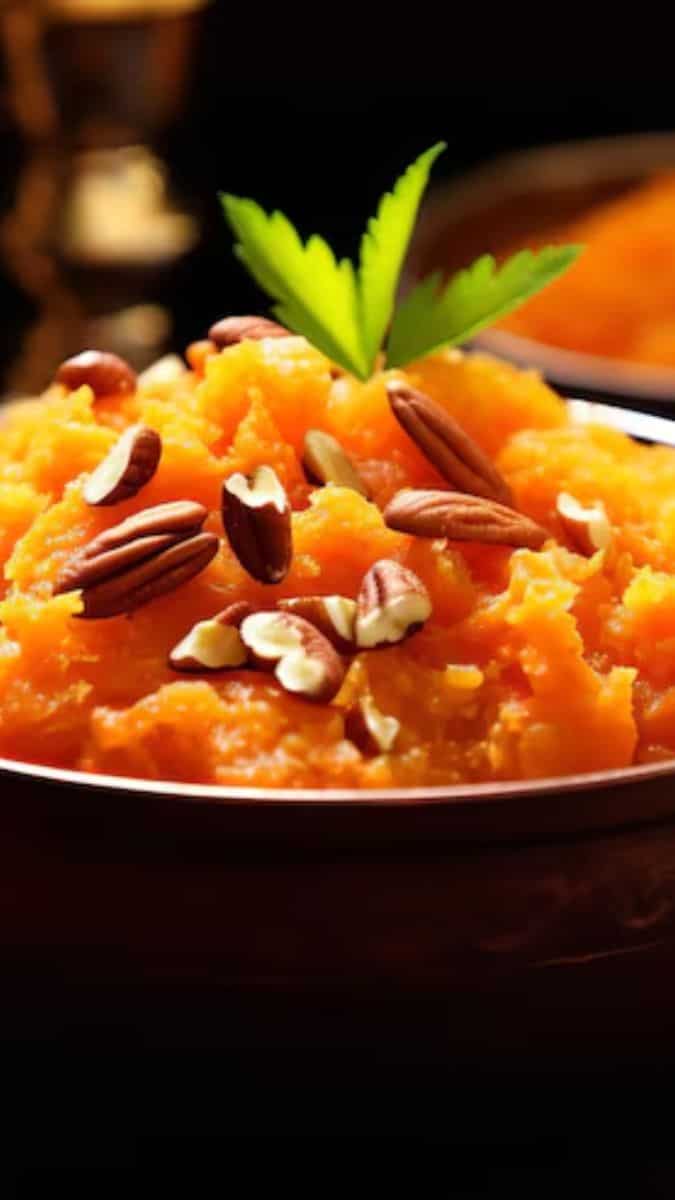 For 20 to 30 minutes, keep cooking the halwa mixture over low heat. Move it to a mould or dish that has been oiled. Use a spatula to smooth the top.