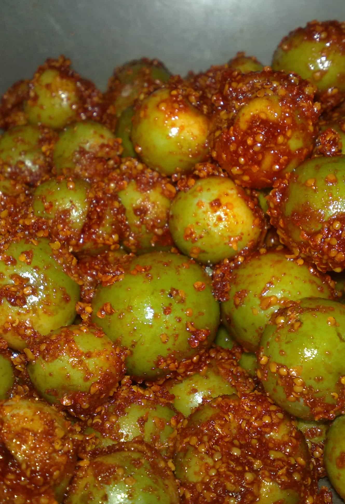250 g gunda (bird lime fruit) 2 tbsp mustard seeds 1 tbsp fenugreek seeds 2 tbsp red chilli powder 1 tbsp turmeric powder 3 tbsp salt 200 ml mustard oil