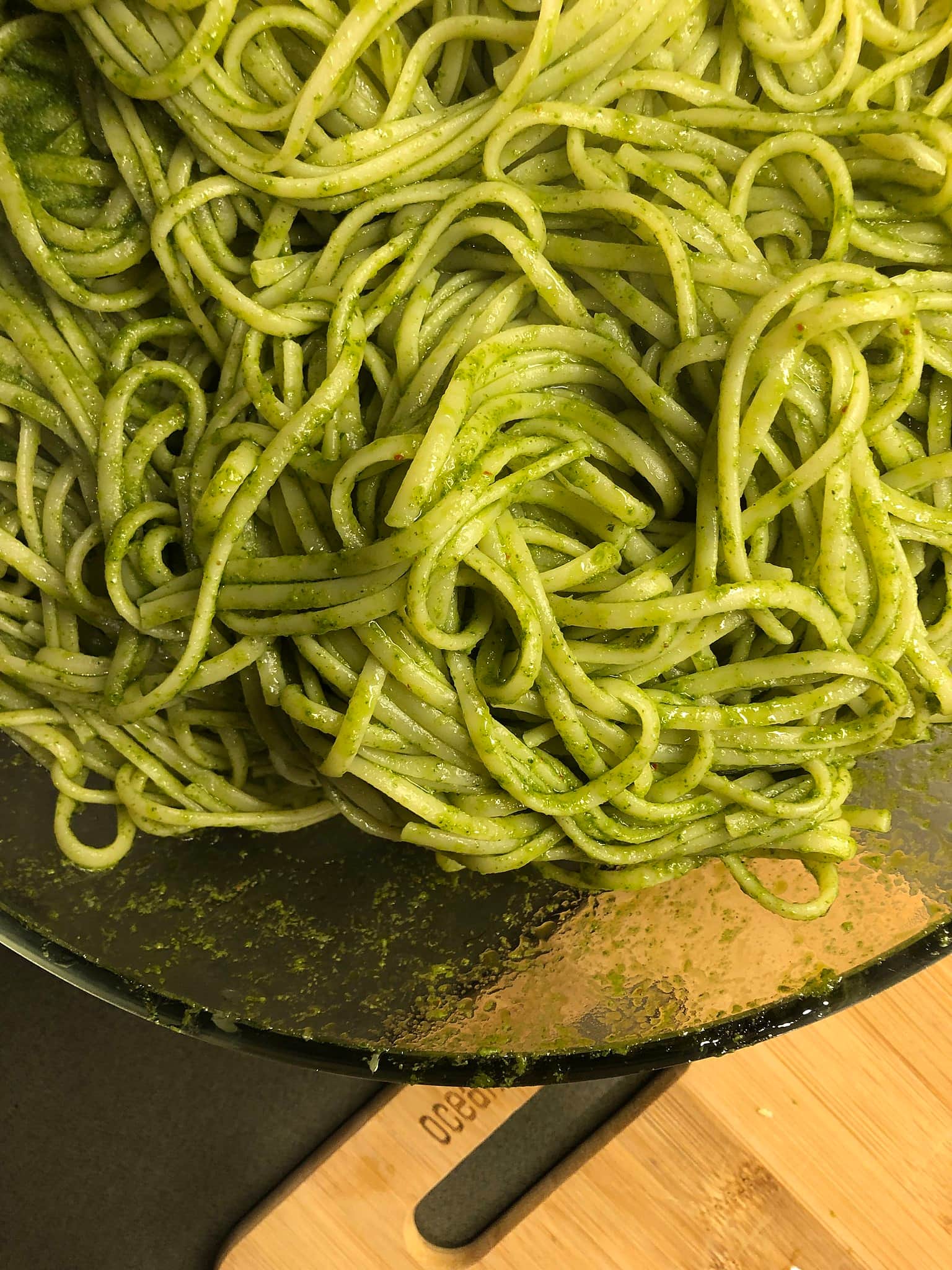 Add the pesto to a mixing bowl along with the cooked pasta and toss for a couple of minutes to mix thoroughly.