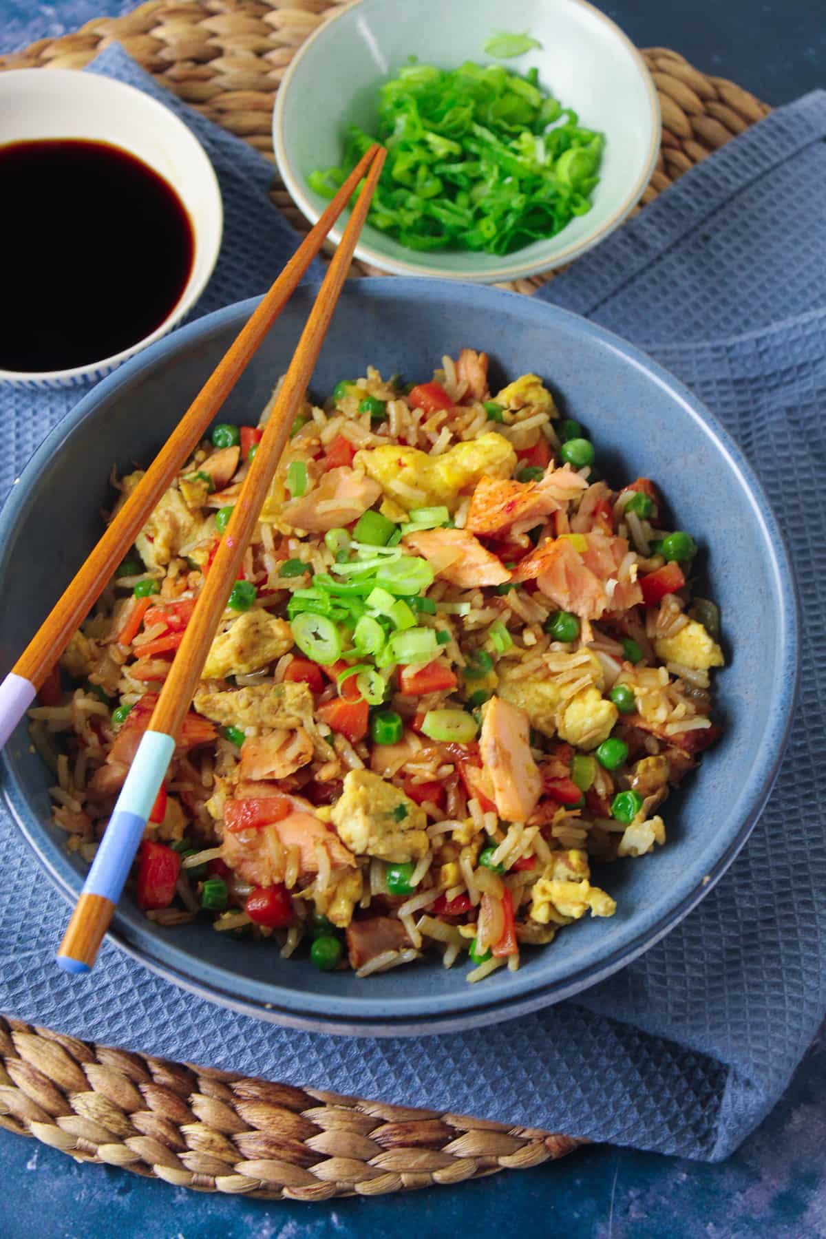 This egg fried rice is best made with cold, leftover rice, which keeps the grains separate and prevents sogginess. Using high heat and very little oil helps retain flavour without heaviness. The eggs coat the rice lightly while vegetables add freshness and crunch. It works well as a quick lunch or dinner.