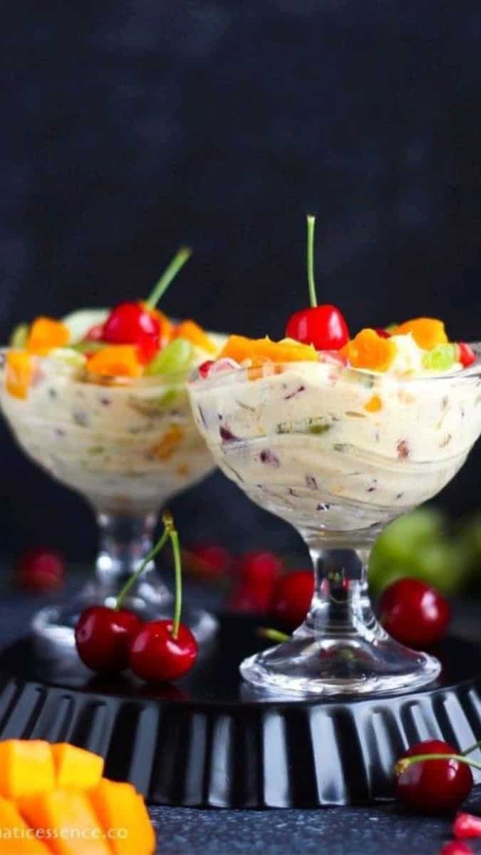 Fruit custard stays light when sweetness is controlled and fruits are added only after cooling. The focus is on a smooth base with fresh texture rather than a heavy dessert feel. It is best served chilled.