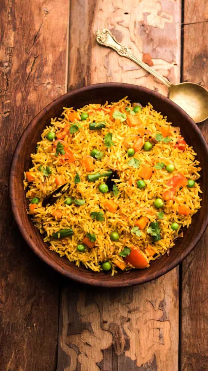बासमती चावल – 1 कप पानी – 2 कप घी/तेल – 2 बड़े चम्मच जीरा – 1 छोटा चम्मच प्याज – 1 (बारीक कटा हुआ) टमाटर – 1 (कटा हुआ) अदरक-लहसुन पेस्ट – 1 छोटा चम्मच हरी मिर्च – 2 (कटी हुई) हरी मटर – ½ कप गाजर – ½ कप (कटी हुई) बीन्स – ½ कप (कटी हुई) हल्दी पाउडर – ½ छोटा चम्मच लाल मिर्च पाउडर – ½ छोटा चम्मच गरम मसाला – ½ छोटा चम्मच नमक – स्वादानुसार हरा धनिया – गार्निश करने के लिए
