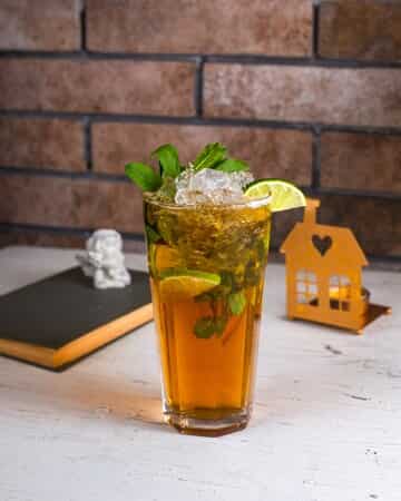 अब चाय को फ्रिज से निकाले और उसमें नींबू का रस मिलाएं। अब किसी अन्य गिलास में 4 बर्फ के टुकड़े डालकर उसमे चाय को डालें। आपकी आइस टी बनकर तैयार है।