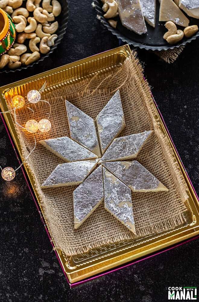 अब मिश्रण को एक चिकनाई लगी प्लेट पर निकालें और बेलन से बेल लें। जब यह ठंडा हो जाए, तो इसके मनचाहे आकार में काट लें। आपकी स्वादिष्ट काजू कतली तैयार है।