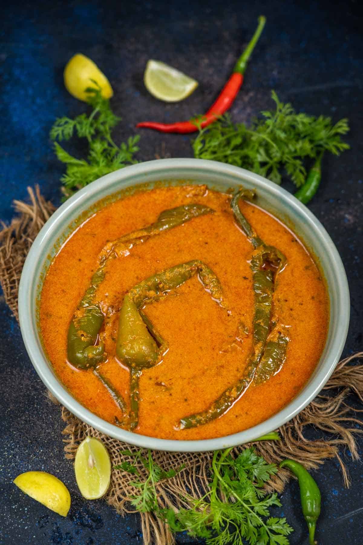 100 ग्राम बड़ी हरी मिर्च 15 ग्राम सूखा नारियल 1/4 कप मूंगफली दाना 3/4 चम्मच जीरा 3/4 छोटा चम्मच सफेद तिल 3/4 चम्मच खसखस 2 प्याज (कटी हुई) 10 लहसुन की कलियां 1 इंच अदरक का टुकड़ा (कटा हुआ) 1 टेबलस्पून हरा धनिया (बारीक कटी हुई) 1/4 चम्मच राई 6 करी पत्ता 1/4 चम्मच जीरा 1/4 चम्मच हल्दी पाउडर 3/4 चम्मच कश्मीरी लाल मिर्च पाउडर 3/4 चम्मच गरम मसाला पाउडर 3 चम्मच इमली का पानी स्वादानुसार नमक 4 चम्मच तेल