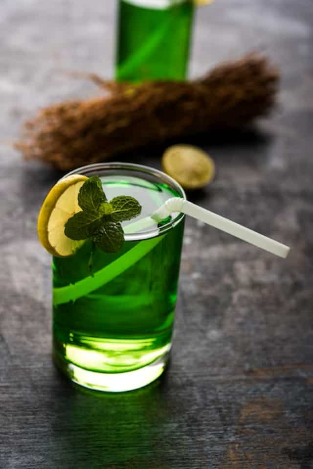 1 छोटा चम्मच खस एसेंस 2 कप पानी 2 कप या स्वादानुसार चीनी 1/2 छोटा चम्मच ग्रीन फूड कलर बर्फ के टुकड़े