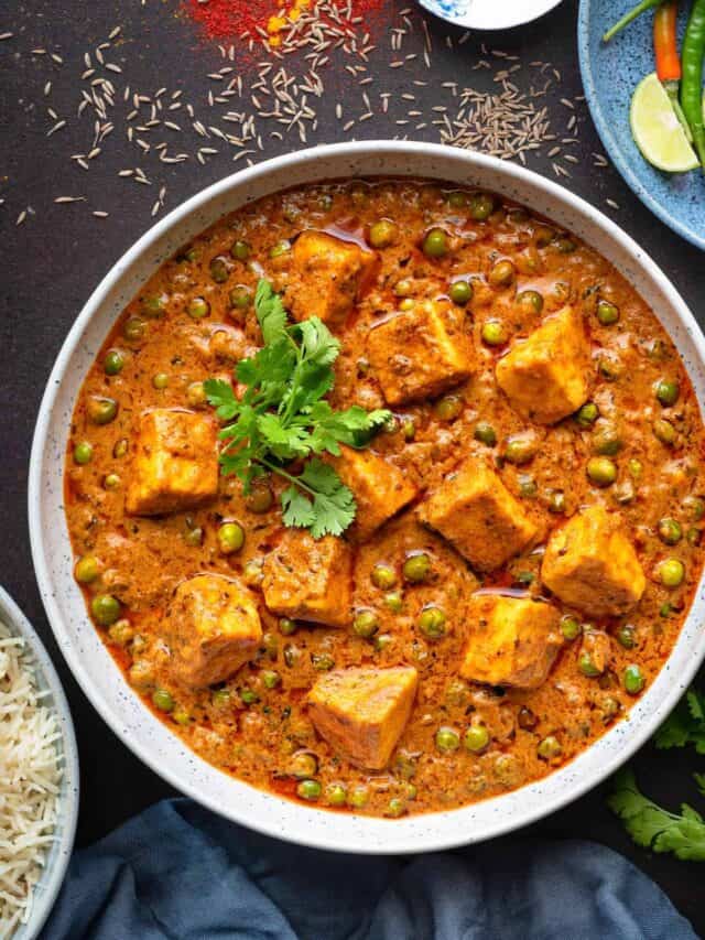 अब तैयार मसाले में पनीर और मटर डालें। अच्छी तरह से मिला लें। 1/2 कप पानी डालकर ढककर 5 मिनट तक पकने दें। जब ग्रेवी थोड़ी गाढ़ी हो जाए, तो गरम मसाला डालें और हरे धनिये से सजा कर सर्व करें।
