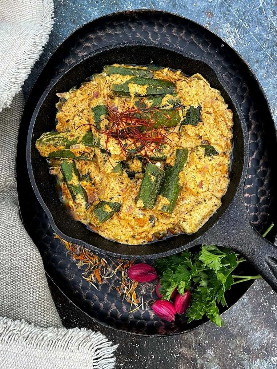 अब इस तड़के को करी में डालकर मिलाएं, और थोड़ी देर तक पकने दें। और इस तरह से दही भिंडी बनकर तैयार है आप इसे गर्मागर्म सर्व कर सकते है।