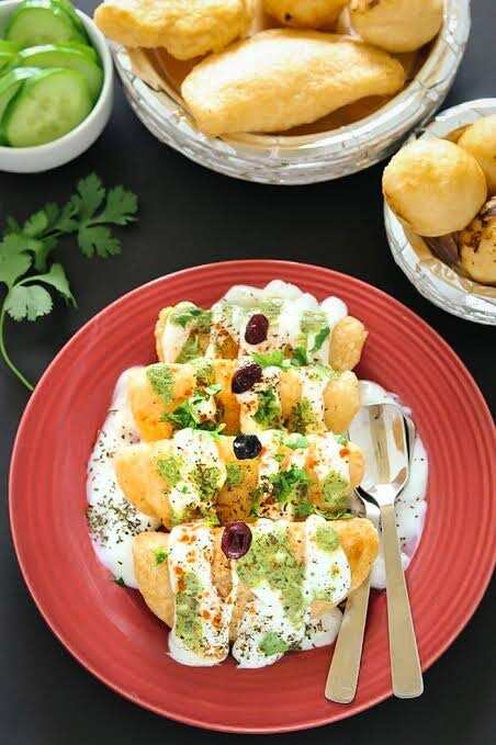 300 ग्राम उड़द की दाल 100 ग्राम मूंग की दाल 8 कप दही (फेंटा हुआ) 4 टेबलस्पून खोया (कद्दूकस किया) 4 हरी मिर्च (बारीक कटी हुई) 2 टेबलस्पून धनिया पत्ती (बारीक कटी हुई) 2 टेबलस्पून काजू (बारीक कटे हुए) 2 टेबलस्पून किशमिश (बारीक कटे हुए) 4 टीस्पून भुना जीरा पाउडर 4 टीस्पून चाट मसाला 2 कप हरी चटनी 2 कप मीठी चटनी स्वादानुसार नमक तलने के लिए तेल