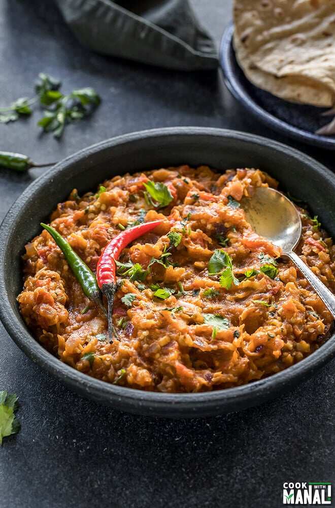जब भरता से खुशबू आने लगे और भरता बनकर तैयार हो जाए तो इसमें घी डालकर एक बार चला लें। फिर इसके ऊपर हरा धनिया डालकर गार्निश कर लें। अब आपका पंजाबी स्टाइल बैंगन भरता बनकर तैयार है।