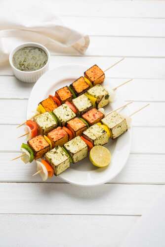 अंत में पनीर टिक्का को शिमला मिर्च, प्याज और हरे धनिए से सजाकर हरी चटनी और सॉस के साथ गरमागरम परोसें।