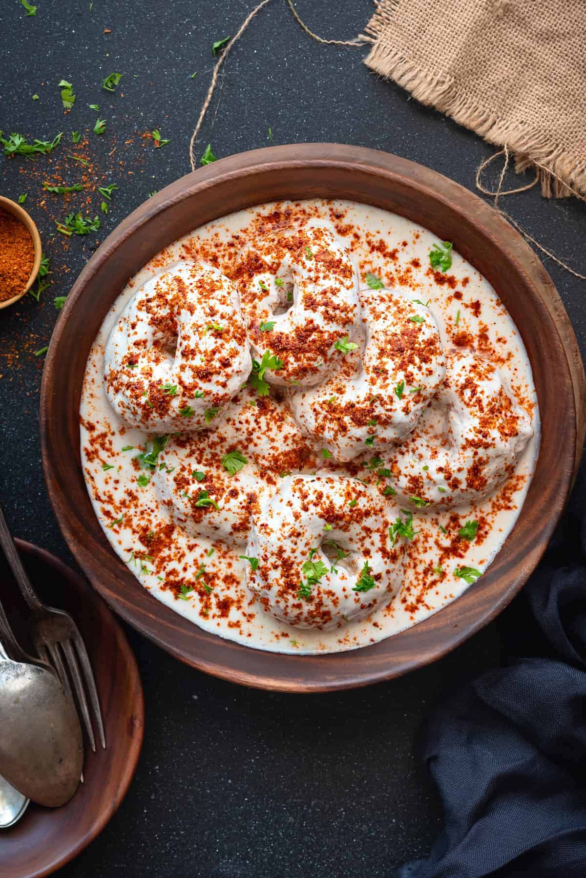 अब इसमें लाल मिर्च पाउडर, जीरा पाउडर, चाट मसाला और काला नमक डालकर खट्टी-मीठी चटनी के साथ परोस सकते हैं। आपके दही बड़े बनकर तैयार हो गए है।
