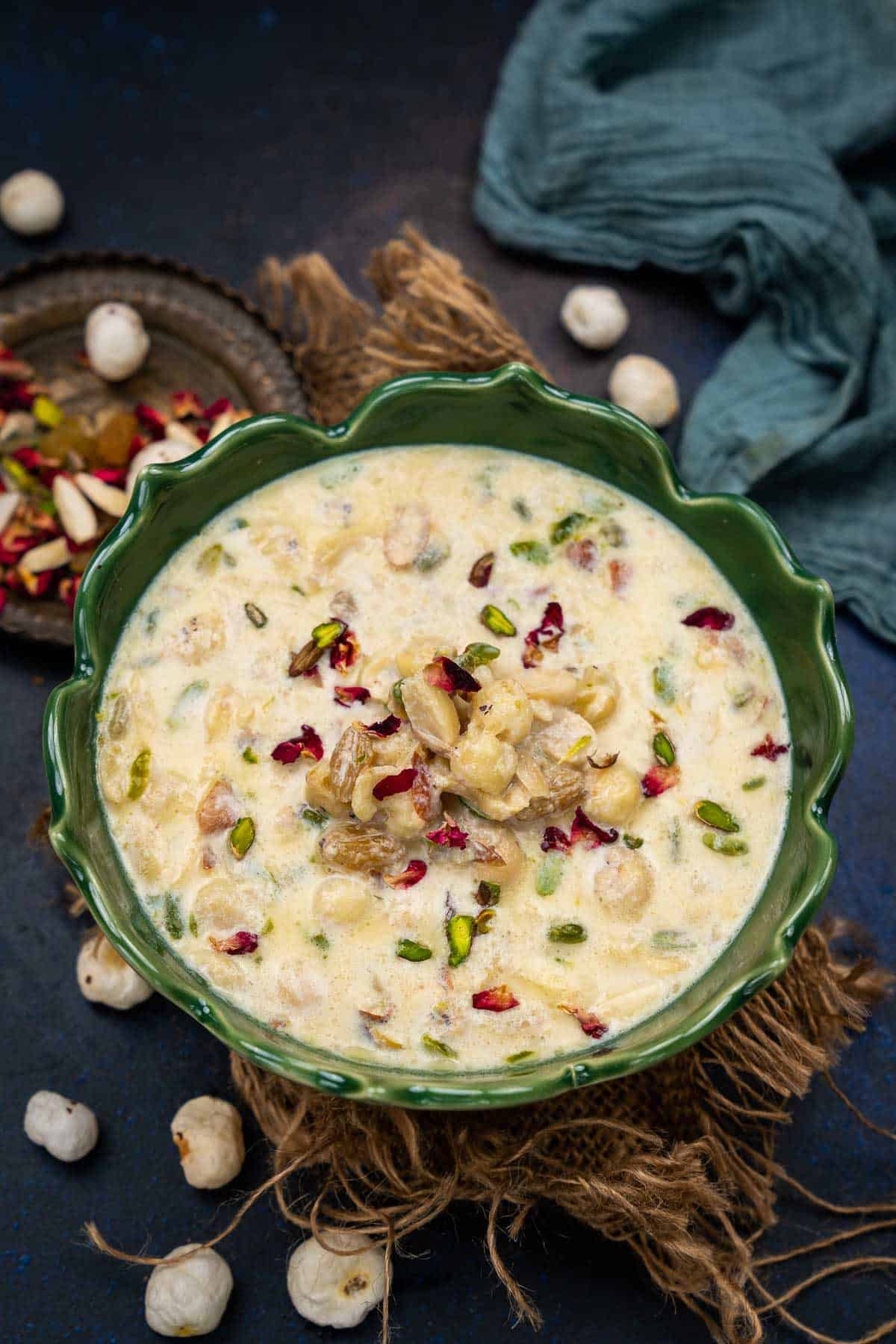 अंत में फ्राई मखाने, बादाम और रोज़ पेट्ल चिक्की से गार्निश करें। सर्व करने के लिए एक प्लेट में खीर फैलाएं और इसमें केले के टुकड़े लगाएं।