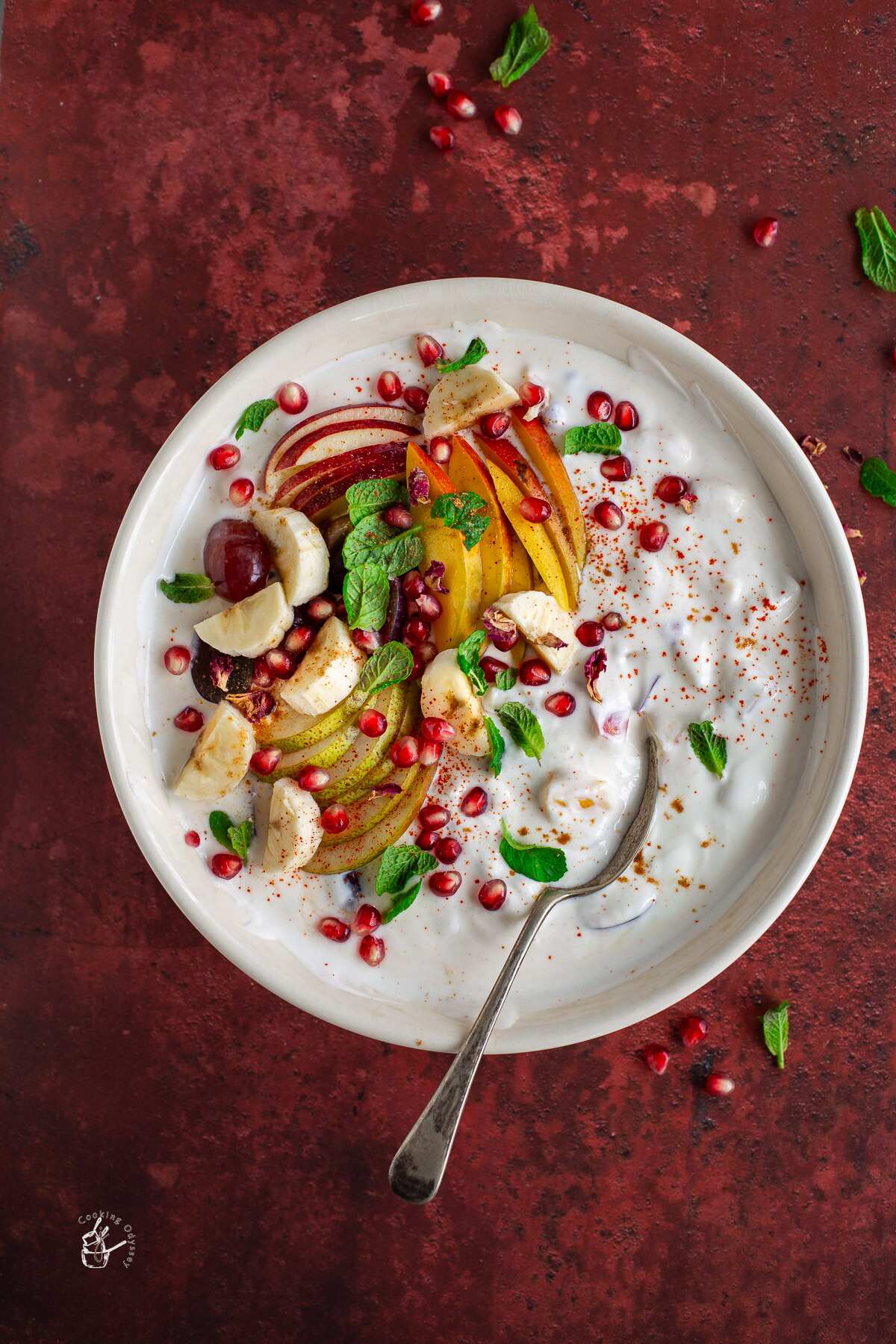 2 कप गाढ़ा दही (फेंटा हुआ) 1/2 कप सेब (बारीक कटा हुआ) 1 केला (बारीक कटा हुआ) 1/2 कप अनार के दाने 1/2 कप हरे अंगूर (कटे हुए) 2 चम्मच चीनी 1 टीस्पून चाट मसाला पाउडर 1 टीस्पून भूना जीरा पाउडर चुटकी भर काली मिर्च पाउडर स्वादानुसार काला नमक