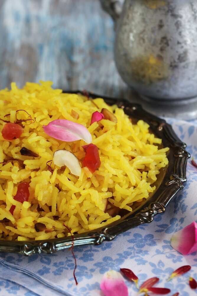 1 कप बासमती चावल 1 कप या स्वादानुसार चीनी 4 टेबलस्पून देसी घी 1 तेजपत्ता 2 लौंग 2 हरी इलायची (कूटकर) 1/4 टी स्पून हरी इलायची पाउडर 12 केसर धागा 2 टेबलस्पून काजू (कटा हुआ) 2 टेबलस्पून बादाम (कटा हुआ) 1 चुटकी पीला रंग (खाने वाला) या हल्दी 5 कप या जरूरत अनुसार पानी