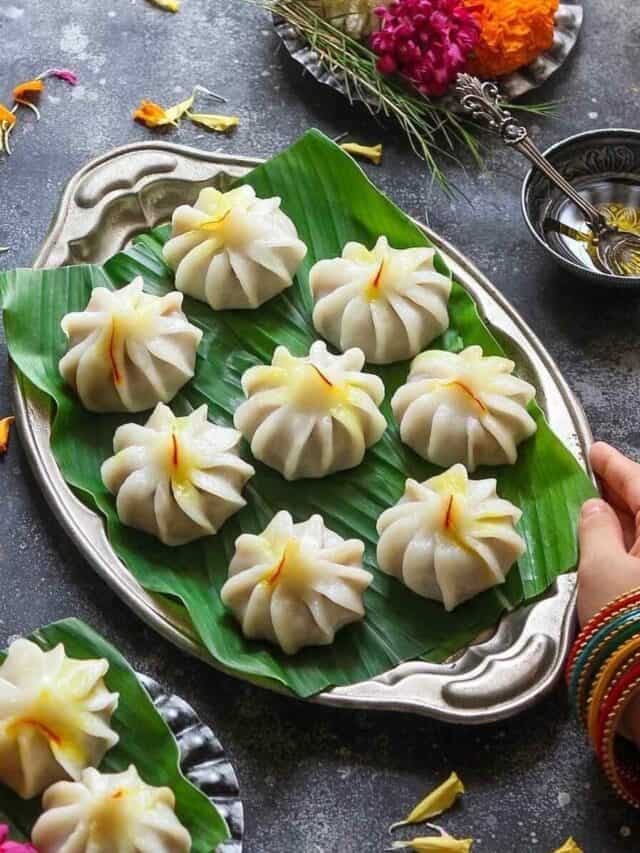 इसके बीच में स्टफिंग रखें, सभी किनारों को इक्कठा करके पोटली बना लें। पोटली को टॉप से सील कर दें। स्टीमर में पानी गर्म करे। मोदक को स्टीमर की प्लेट में लगाएं और स्टीम करें। गरमागरम मोदक पर घी डालकर इन्हें सर्व करें।