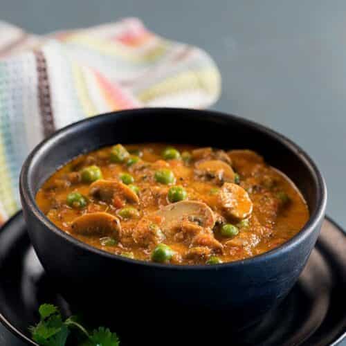 अब इसमें कटे हुए मशरूम और मटर डालें। इन्हें अच्छे से मिला लें और 5-7 मिनट तक पकने दें। गरम मसाला और हरा धनिया डालकर अच्छे से मिला लें। फिर इसे गरम-गरम रोटी या चावल के साथ परोसें।