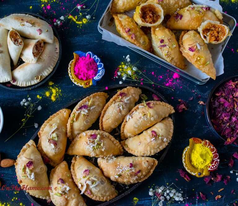 इसके बाद मध्यम आंच गैस पर एक कढ़ाई में घी डालकर गर्म करें। जब घी अच्छी तरह से गर्म हो जाए तो उसमें गुजिया डालकर क्रिस्पी और सुनहरा भूरा होने तक तल लें।