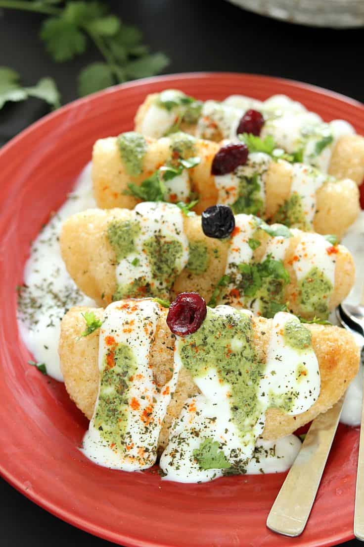 2 cups of all-purpose flour 2 tablespoons of ghee 1 cup khoya or mawa 2 tablespoons of chopped dry fruits 2 tablespoons of sugar 500 grams of thick curd 2 teaspoons of sugar ½ cup of tamarind chutney ¼ of a teaspoon red chilli powder 1 teaspoon of roasted cumin powder Oil as needed Water as needed Fresh coriander, chopped