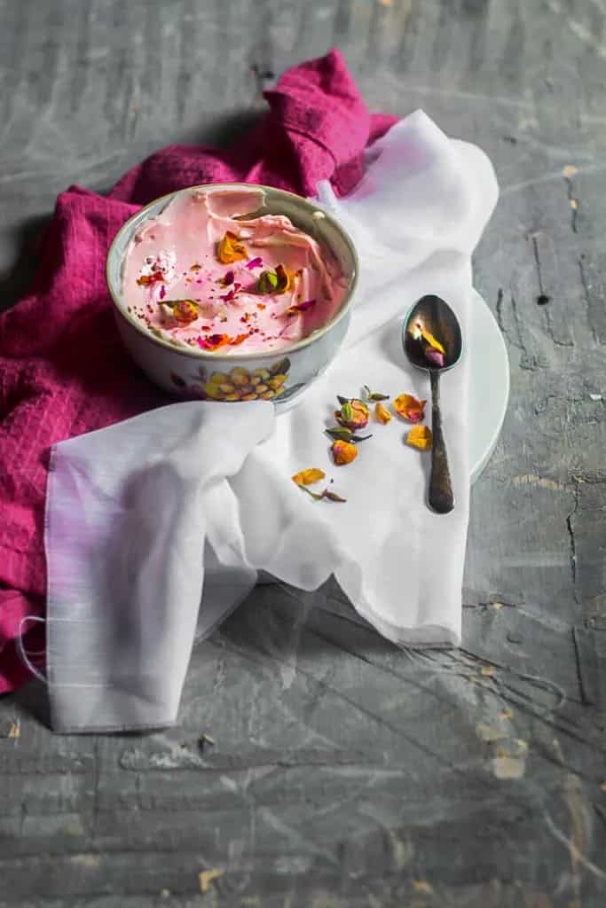 Shrikhand is a traditional dessert from Maharashtra and Gujarat, prepared by straining curd until thick and creamy. During Holi, flavoured versions are often served alongside festive meals. Rose shrikhand adds floral sweetness and a soft pink tone suited to spring celebrations. The texture should be smooth and chilled. Nuts provide light crunch and contrast.