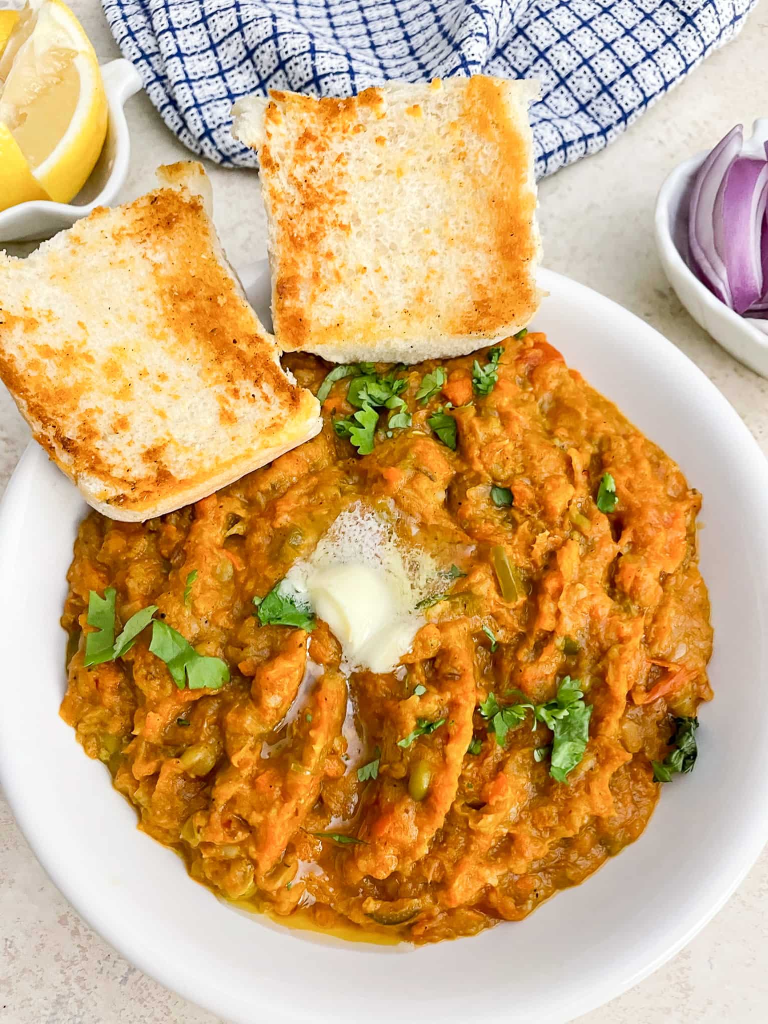 Roast pav with some butter. Pav bhaji is ready. Serve it along with a piece of lemon and onion.