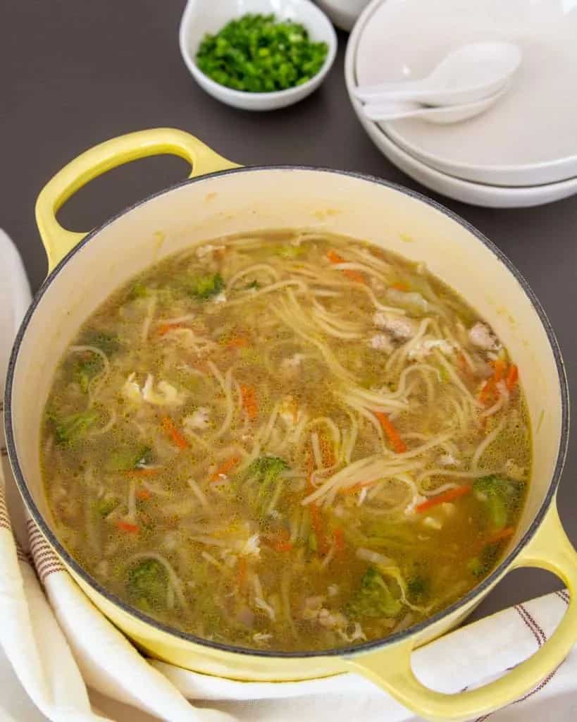Add the whole corn kernels, soy sauce, salt, and white pepper to this broth. Stir everything well and simmer the soup for a few minutes.