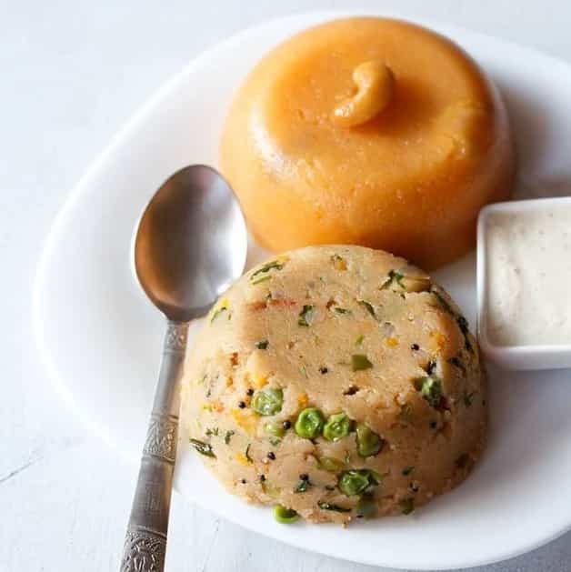 Chow chow bath is a traditional Karnataka meal where khara bath (savory) and kesari bath (sweet) are served together on the same plate. The contrast of flavours is intentional and reflects temple-style cooking where balance is central. Both components are prepared separately but served together.