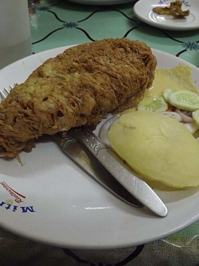 Fish kabiraji is a popular Bengali street food dish made with fish fillets coated in a crispy batter and deep-fried to perfection. It is served with a tangy kasundi sauce and is a favourite among seafood lovers.