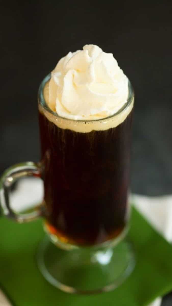 2 shots of espresso 1 tsp sugar or as needed 2 tbsp hot water 1 tablespoon of chocolate syrup or cocoa powder 1 cup of steamed milk 60ml Old Monk rum Hot water, as needed Whipped cream Crushed chocolate of your choice