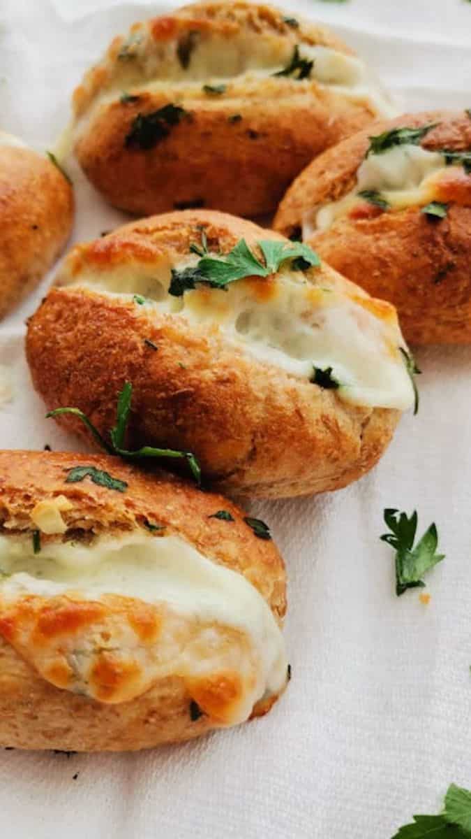½ cup warm water 1 ½ tsp sugar 1 ½ tsp active dry yeast 2 cups all-purpose flour ½ tsp pizza seasoning ½ tsp salt 1 tsp garlic paste ¼ cup fresh coriander, chopped 1 tbsp oil ¼ cup + 2 tbsp water 1 tsp butter ½ cup milk 1 cheese cube or 2 cheese slices Salt to taste