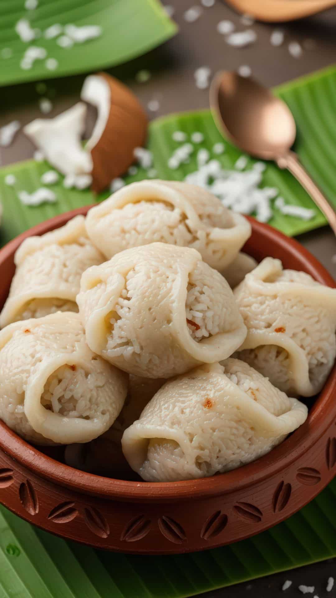 200 g rice flour 250 ml warm water 100 g chana dal, soaked for 3–4 hours 1 small onion, finely chopped 1 green chilli, finely chopped 1 tablespoon mustard oil ¼ teaspoon turmeric powder Salt, to taste Banana leaves or a lightly greased steamer plate, for steaming