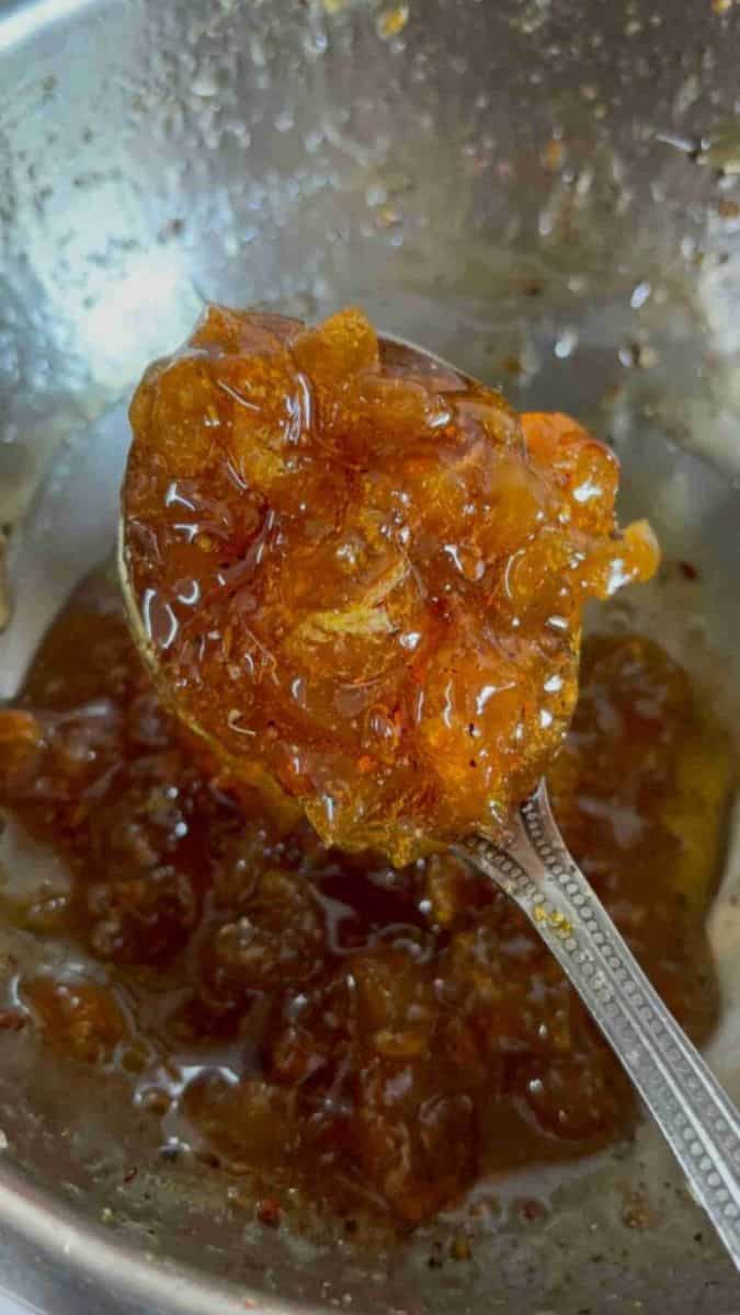 In a separate pan, add 1 cup of water and sugar. Cook the amlas on medium heat.