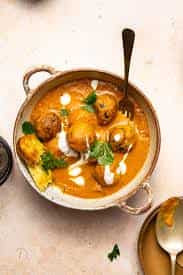 Shallow-fry the meatballs for a crunch. Toss and turn until brown. Add the creamy gravy to it. Garnish with coriander and cream. Serve.