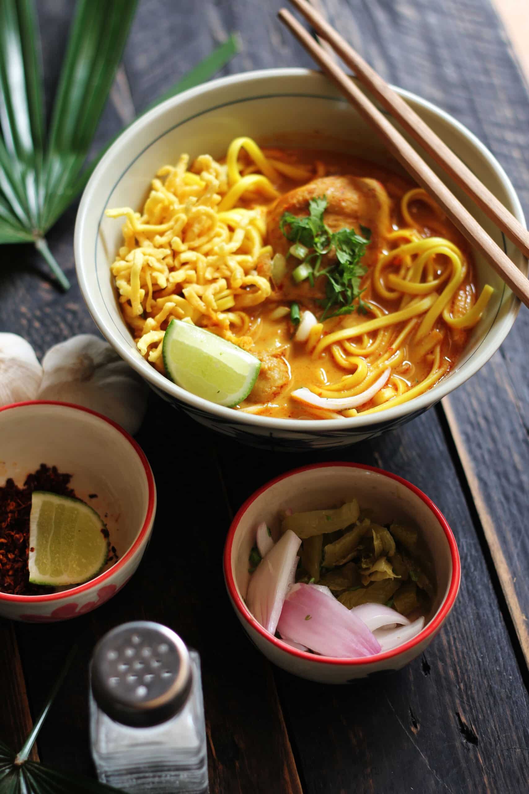 200 g noodles (egg or rice noodles) 1 cup boiled chicken or vegetables 1 onion (chopped) 1 tbsp curry powder 1 cup coconut milk 1 tbsp oil Salt to taste Toppings: fried garlic, spring onions, lemon wedges
