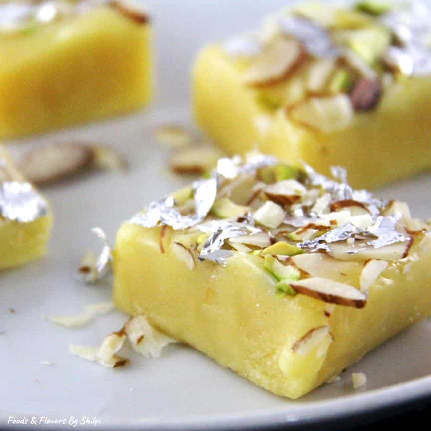 Continue cooking until the barfi mixture leaves the sides of the pan and looks glossy.