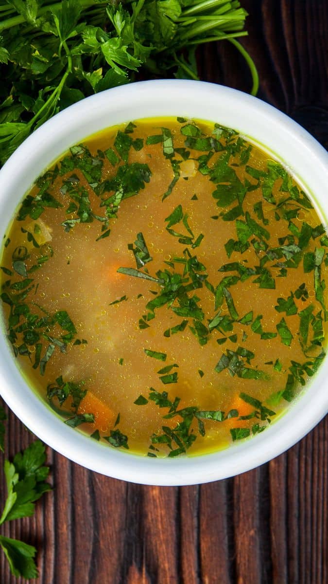 1 tbsp oil 1 tsp ginger-garlic (chopped) 1 small onion (finely chopped) 4 cups vegetable stock 2 tbsp lemon juice 3 tbsp coriander (chopped) Half a spoon of pepper Salt to taste
