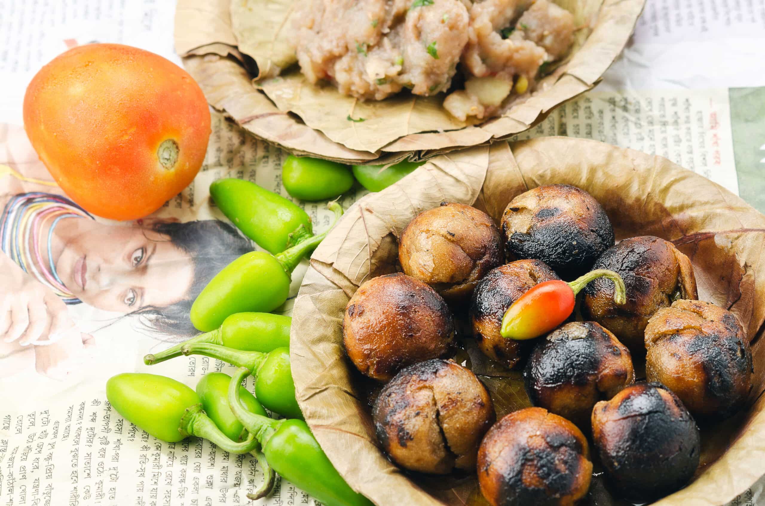 For chokha, mash roasted eggplant, tomato, and potato with spices and oil; serve hot with litti.