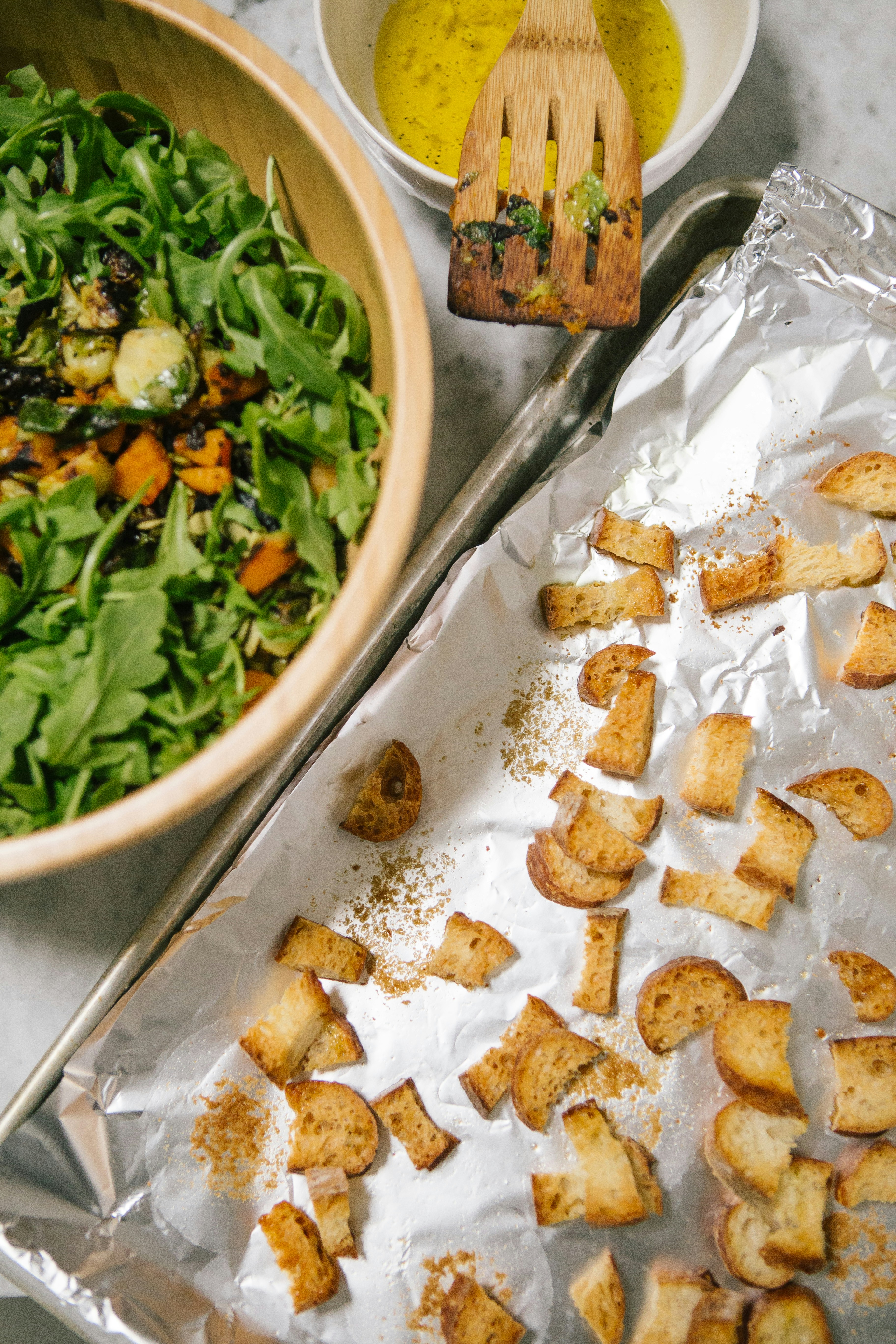 Once you coat cubes of your bread in some kind of a fat, make sure that the seasonings are evenly distributed.