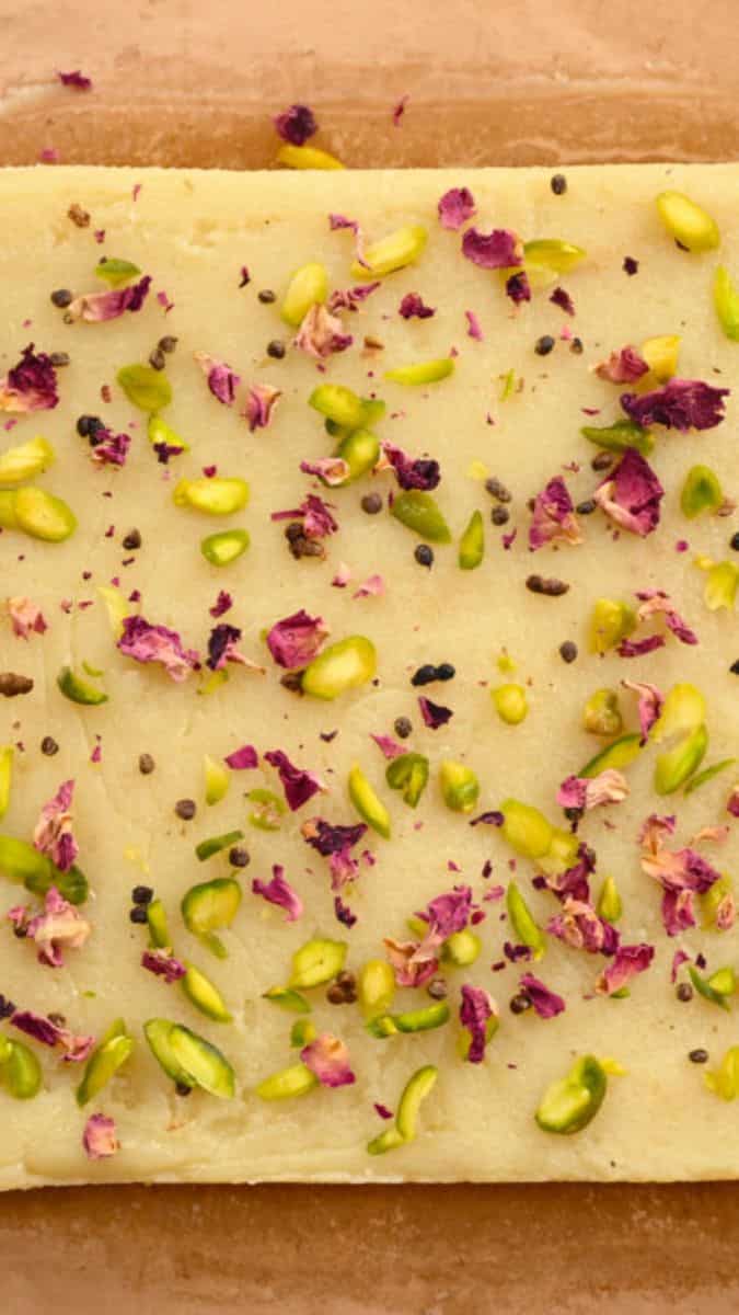Garnish it with chopped pistachios and rose petals. Cut and serve.