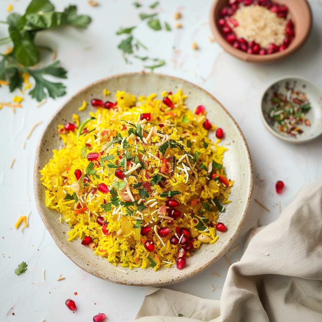 Place the poha on a plate. Garnish with jeeravan masala, boondi, onions, pomegranate seeds and peanuts. Serve hot with jalebis.