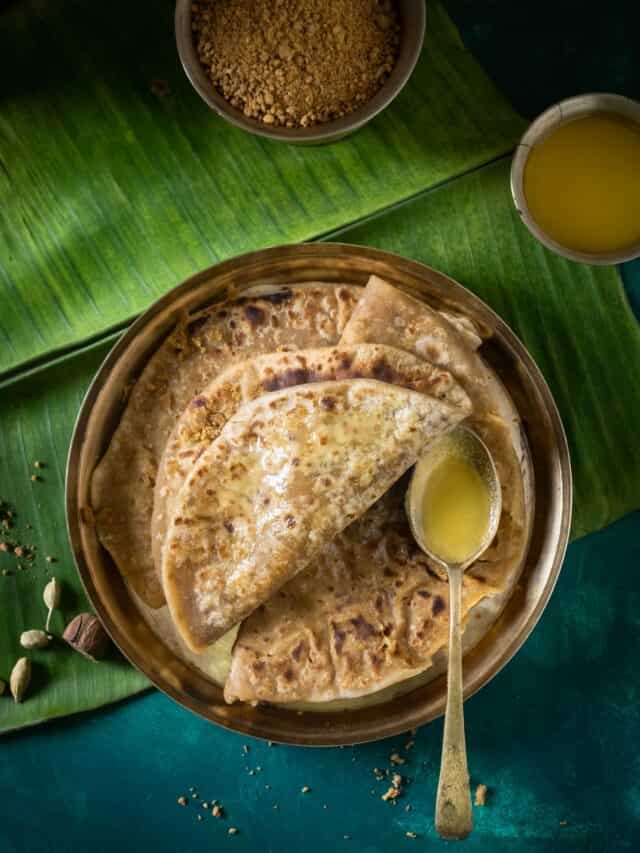 A Maharashtrian dessert, puran poli, is filled with a sweet mixture of jaggery and split chickpeas.