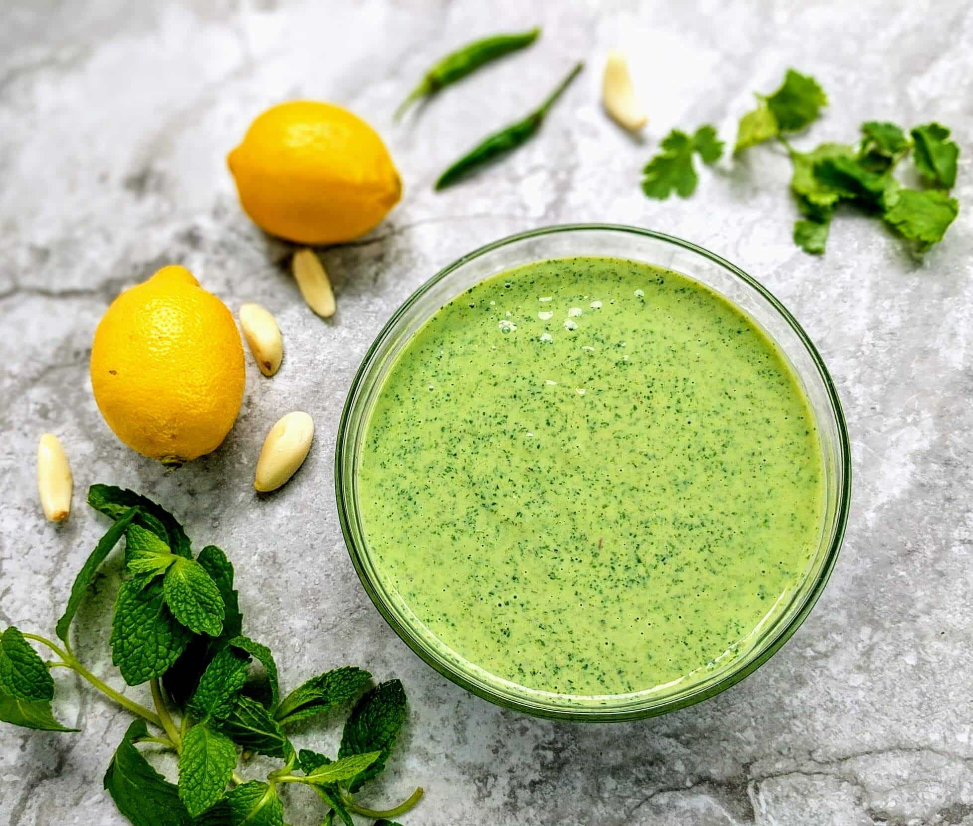 Blend fresh mint and coriander leaves with green chilli, ginger, lemon juice, and salt. Add a bit of water to get the right consistency. This works with pakoras, sandwiches, and parathas.