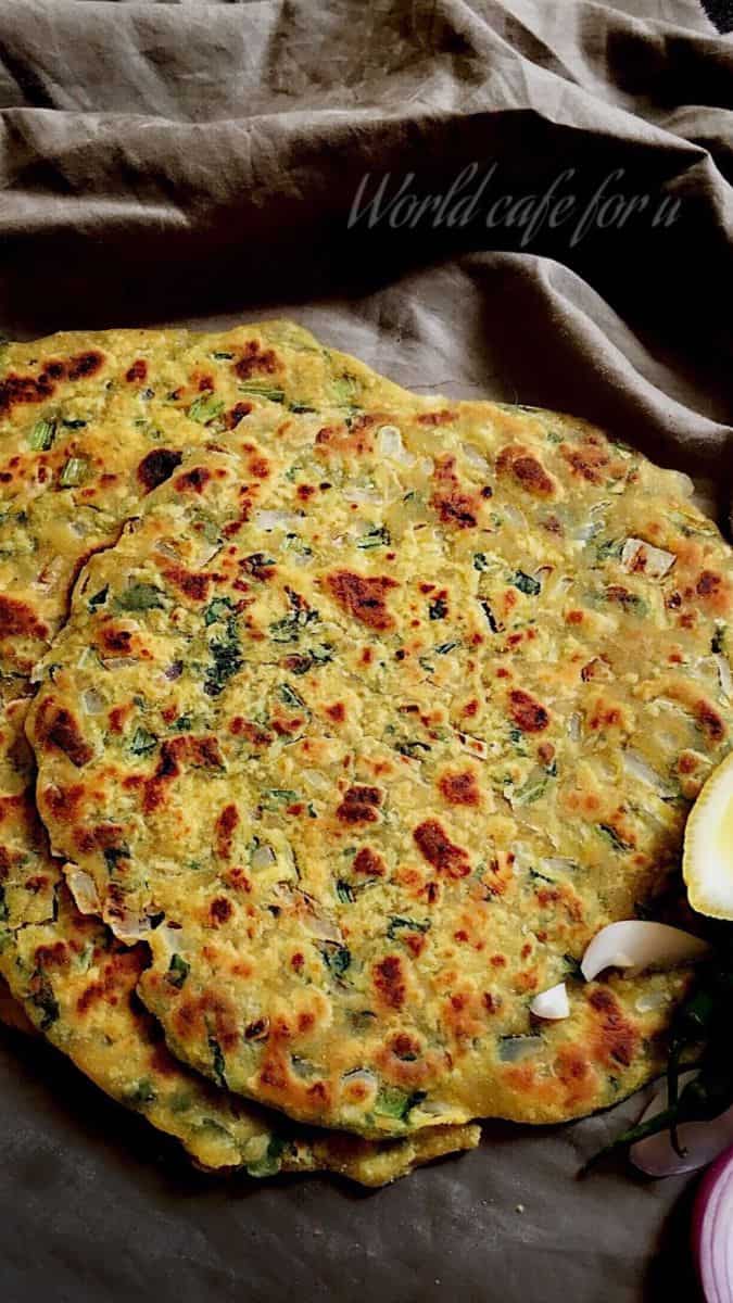 1 cup wheat flour ½ cup gram flour (besan) 1 tbsp chopped onion 1 tbsp chopped coriander 1 green chilli, chopped ½ tsp ajwain ½ tsp turmeric powder Salt to taste Water as needed 1 tbsp oil or ghee